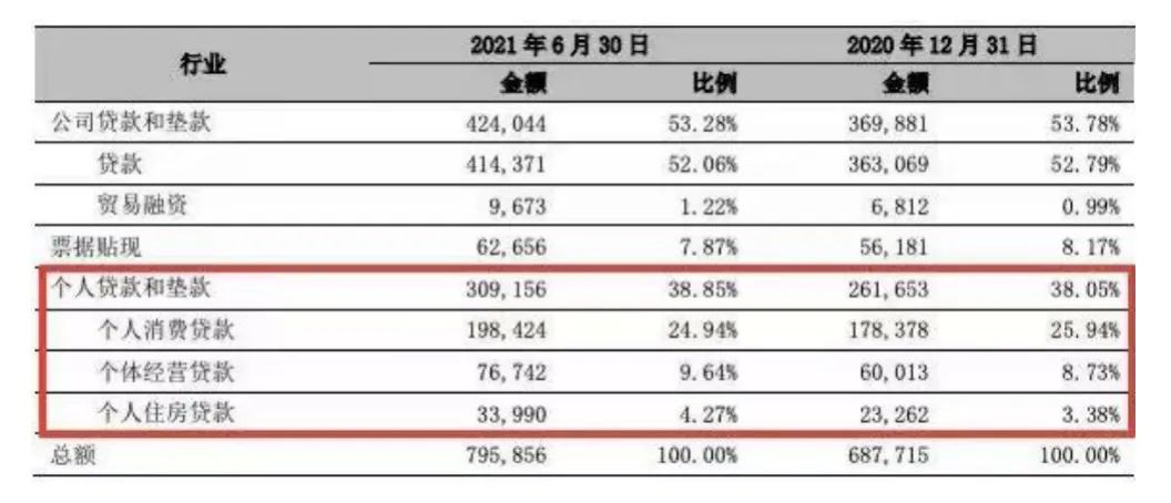 表 1:寧波銀行2021年上半年個(gè)人貸款金額與占比情況
