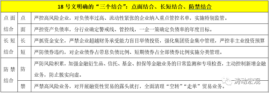 (二)考慮到3號文延續了《關于國有企業資產負債約束的指導意見》的要求和精神,基本上可以被視為是18號文的配套細則,因此3號文的適用性亦可以進一步推廣到河南省以外的地區。因此18號擬定的一些原則仍然值得關注,如下表所呈現的“三個結合”。