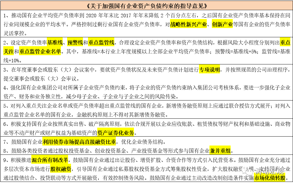 1、根據2018年9月13日中辦和國辦發布的《關于加強國有企業資產負債約束的指導意見》,3號文按照資產負債率的基準線、預警線和重點監管線等三線要求對地方國企實行名單制管理,即對資產負債率超過警戒線和重點監管線的企業,根據風險大小程度分別納入兩重(即重點關注和重點管控企業)。