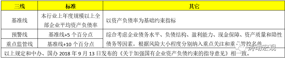 從具體內容上看,3號文延續了《關于國有企業資產負債約束的指導意見》的要求和精神,很多內容具有較好的契合性,如均提出按照基準線、預警線和重點監管線等三線進行資產負債率管理,并相應設定重點關注企業和重點監管企業。