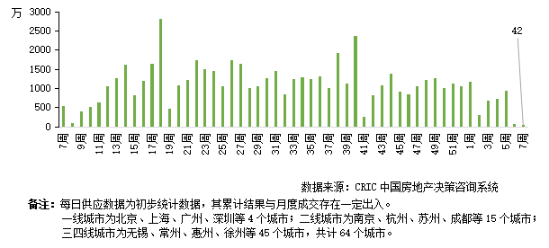 2022年第7周,全國重點城市共取得預售證面積42萬平方米,環比下降35%。