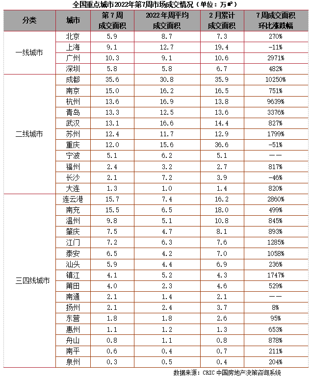 2022年第7周成交低位回升。一線城市成交指數為53.22,環比增長30.76點;二線城市成交指數為41.82,環比增長30.00點;三四線城市成交指數為92.07,環比增長79.19點。
