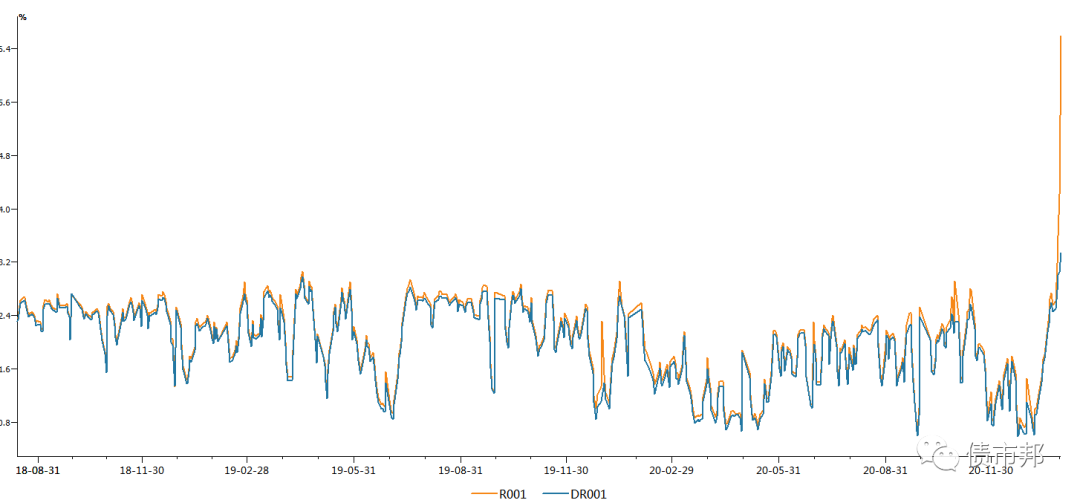 銀行間市場的質押式回購隔夜利率R001飆升到6.58%的近6年高位,DR001這個銀行機構押利率借錢的最優市場利率也達到了3.33%??紤]到R001的價格是包含了DR001的,那非銀機構押信用債借錢的平均成本很可能已經達到了接近10%的水平了。