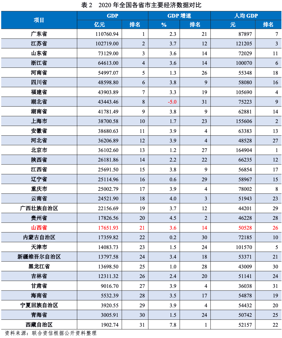 山西省主要經濟指標在全國排名靠后。2018-2020年,山西省地區生產總值(GDP)持續增長,按由強到弱排序,山西省2020年GDP位列全國第21位;同期,山西省GDP增速不斷下降,但均略高于當年全國平均水平。2018-2020年,山西省人均GDP持續增長,2020年為全國平均水平的69.74%,在全國位居第26名。2018-2020年,山西省城鎮化率逐步提高,2020年城鎮化率達到42.90%,低于全國水平(超過60%)。