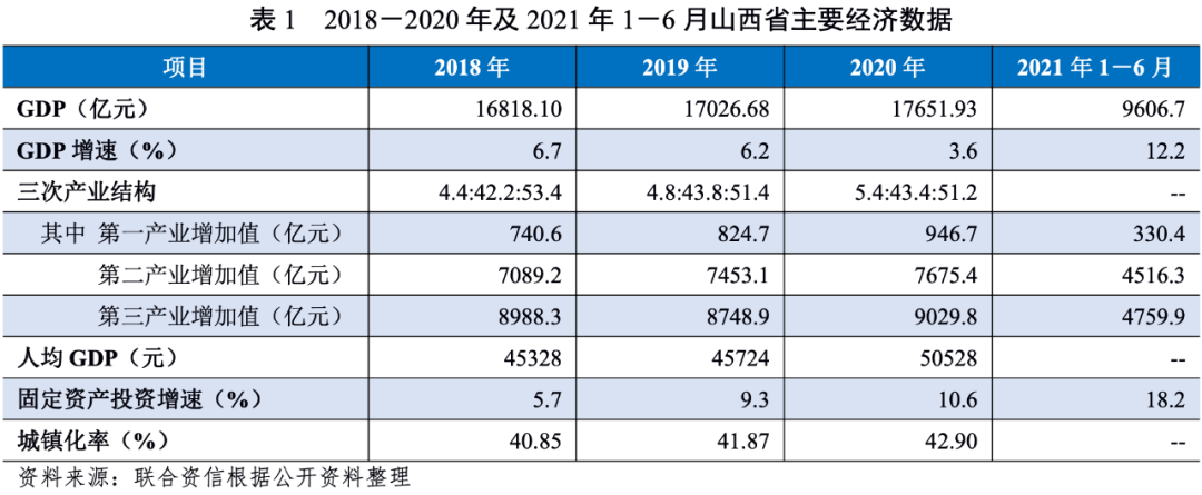 山西省自然資源稟賦良好,近年來經濟穩步發展,整體經濟發展水平處于全國下游,經濟總量及人均GDP在全國排名靠后。受新冠疫情影響,2020年山西省地區生產總值增速同比有所下降。2018-2020年,山西省第二產業占比波動上升,對煤炭產業依賴性強,在碳達峰和碳中和目標的背景下,山西省面臨較大的產業升級和結構調整壓力。2020年,山西省一般公共預算收入規模在全國排名第16位,稅收占比較高但財政自給程度一般,中央補助規模大且持續性好。2020年山西省政府負債率為26.13%,政府債務負擔較輕;山西省政府債務率為78.17%,償債能力較強。