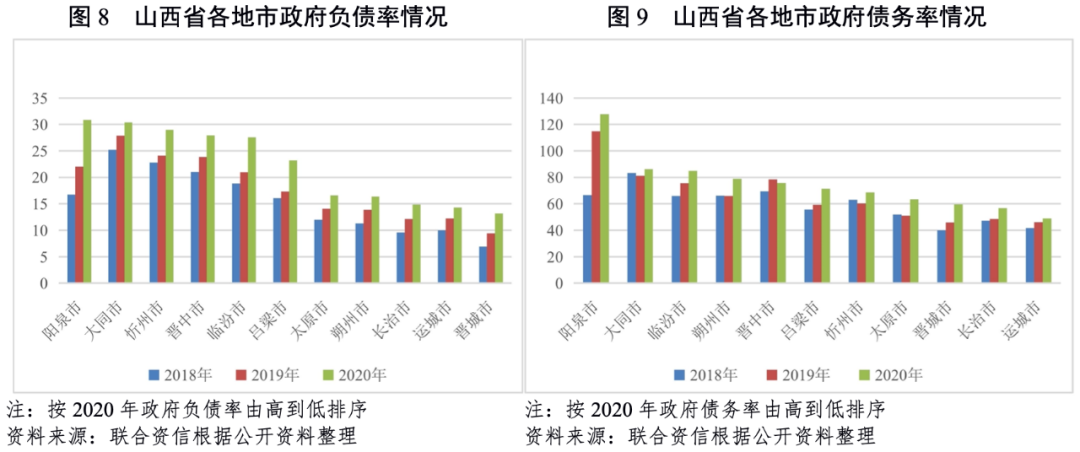 從地市層面看,山西省下轄各地市的經濟及財政實力差異較大。太原市的經濟發展水平和財政實力遠高于其他地市。山西省各地市政府債務余額均呈快速上升趨勢,晉城市增長最快。2020年,山西省各地市的負債率均較上年有所上升,但債務負擔仍處于較輕水平。陽泉市償債能力排名靠后,各地市整體償債壓力不大。