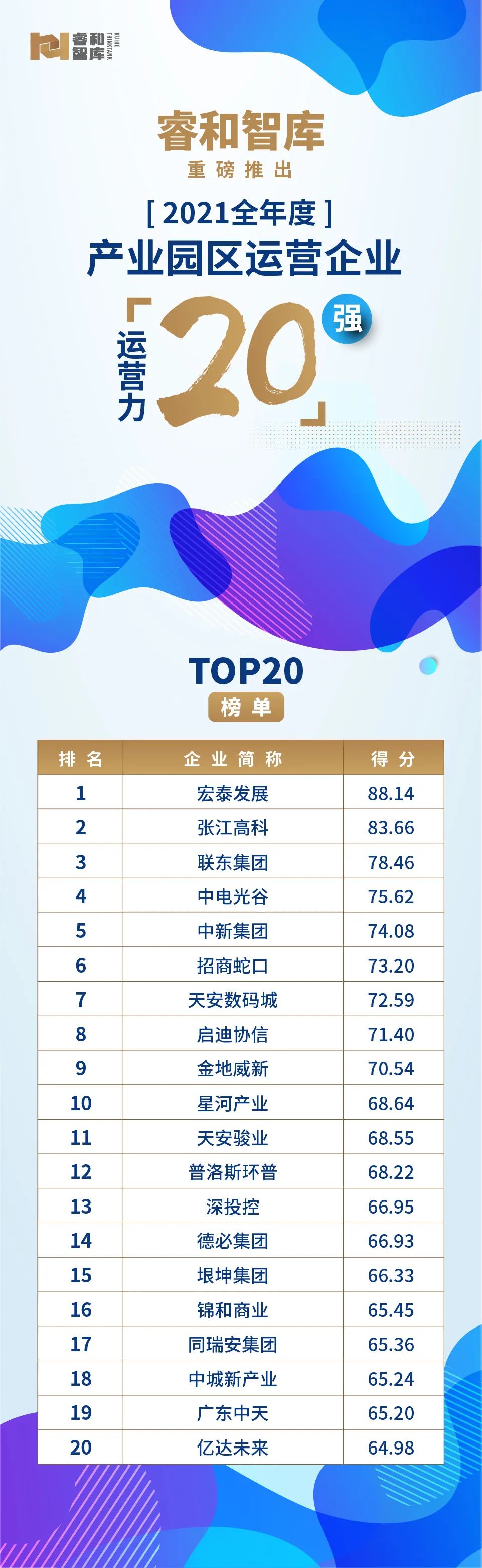 睿和智庫研究部通過對眾多產業園區企業的長期跟蹤與研究,推出“2021全年度產業園區運營企業運營力20強榜單”,力圖從管理規模、項目布局、資管水平等多方面解讀其運營力表現,并對產業地產相關行業發展動態進行分析,以資借鑒。