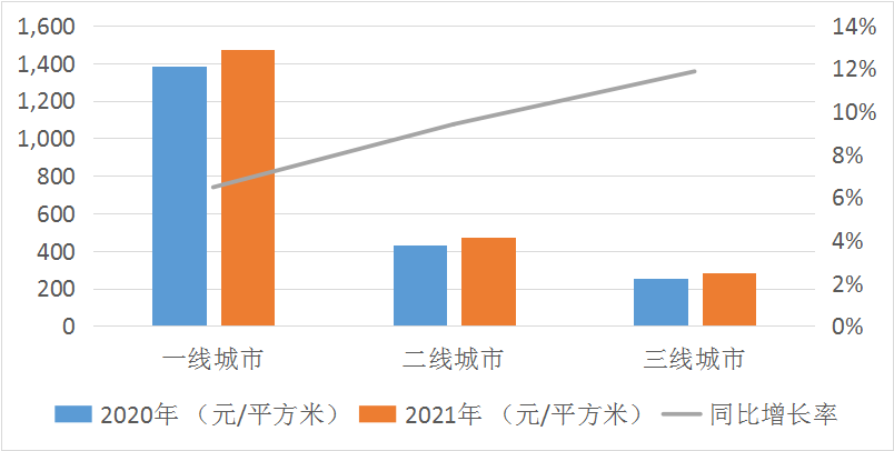 2021年,工業用地成交均價較2020年整體上漲。1~12月,一、二、三線城市工業用地成交均價分別為1471.27元/平方米、472.4元/平方米、281.17元/平方米,較2020年同比分別增長6.46%、9.41%、11.86%。