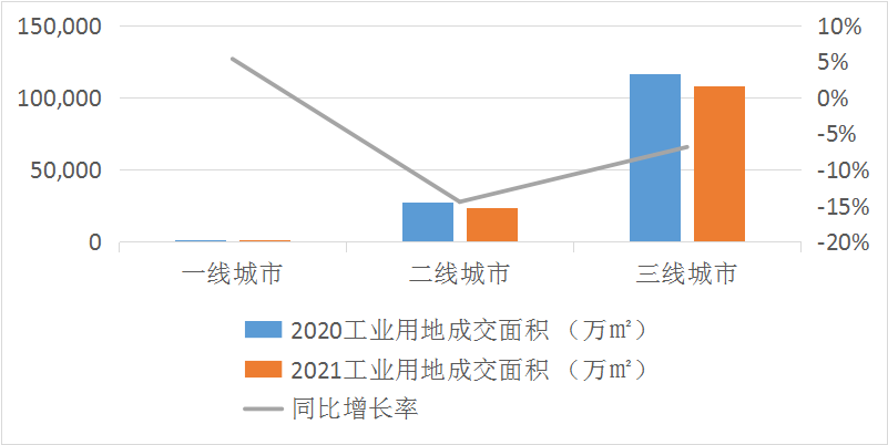 2021年,全國工業用地總成交面積為133,512.71萬平方米,相較于2020年減少8.19%。一、二、三線城市工業用地總成交面積分別為1,638.64萬平方米、23,648.62萬平方米、108,225.45萬平方米,較2020年同期增長率分別為5.36%、-14.49%、-6.87%。
