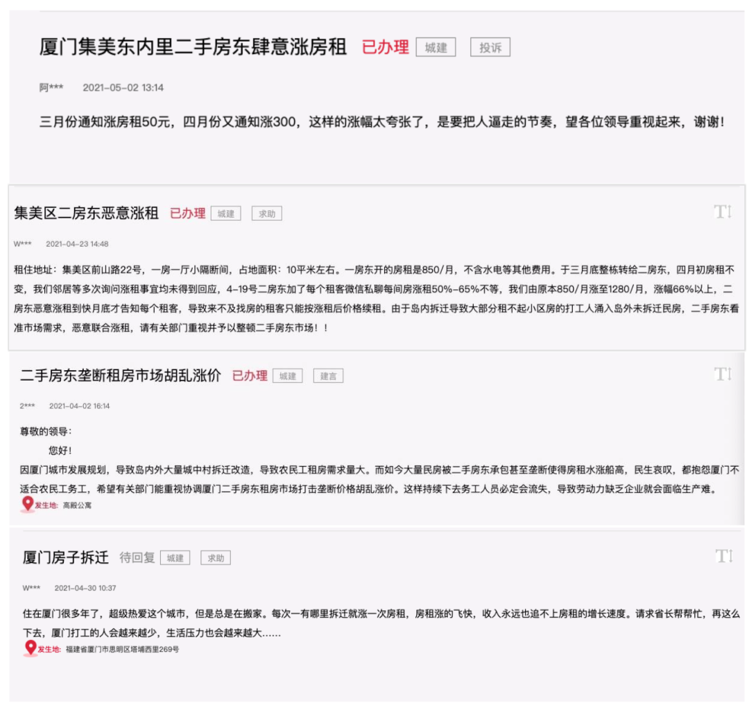 所以,沒有被拆遷波及的城中村以及小區(qū)的房源變得緊俏,租客們時不時就會收到房東發(fā)來的漲租問候。在人民網(wǎng)的「領(lǐng)導(dǎo)留言板上」,有不少廈門租客反映被無序漲租。